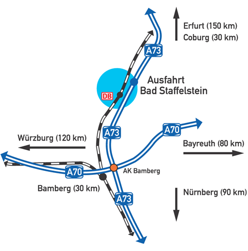 Über die A3 / A6 / A9 bis zum Autobahndreieck Nürnberg/Fürth/Erlangen, weiter auf der A73 Richtung Bamberg/Suhl, Ausfahrt Bad Staffelstein oder Bad Staffelstein Kurzentrum.